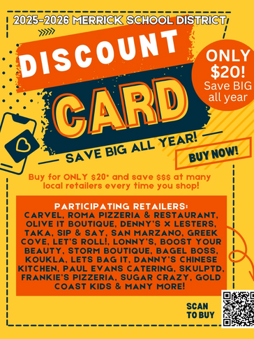 Get the 2025-2026 Merrick School District Electronic Discount Card for only $20 and save $ at many local retailers every time you shop.
